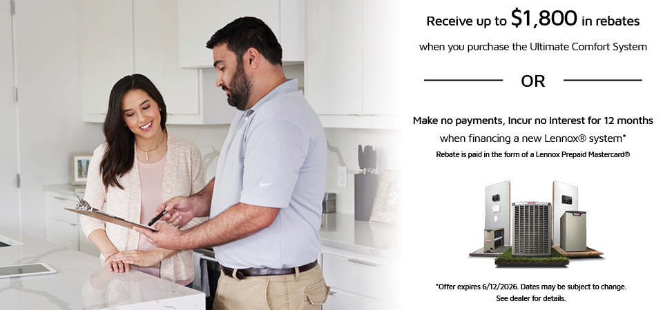 Receive up to $1,800 in rebates* when you purchase the Lennox® Ultimate Comfort System™ OR qualified Buyers make no payments, incur no interest for 12 months** when financing a new Lennox® system